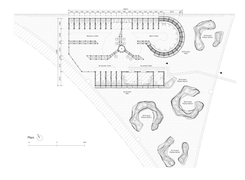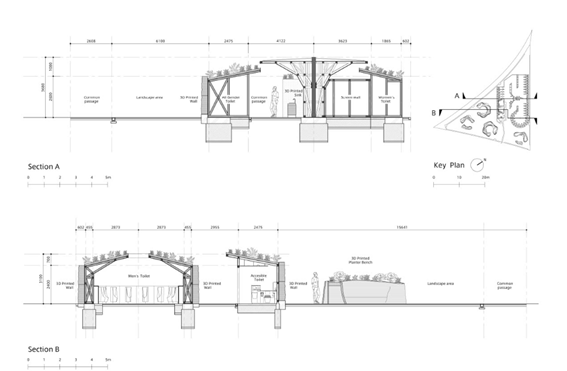 「土」は循環性の高い材料であり、今回のような期間限定の建物に対しては適した材料であると考えます。建物が役割を終えた後は、文字通り「土」に還るのです。そして「3Dプリンタ」は、この「土」に様々な形態を与えてくれます。本建物では、外装材としての形態・機能を「3Dプリンタ」を活用して「土」に実装しています。
