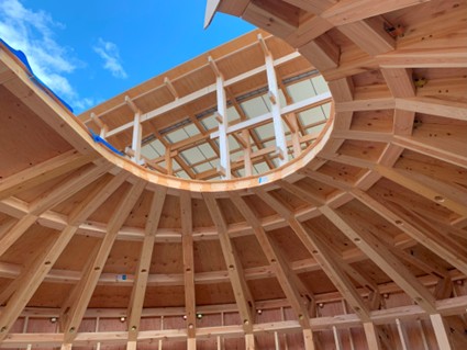 男子トイレの木造立面トラス架構はコストと施工性、加工精度を工夫して設計した部分で、接合部の複雑形状に加工したLVLを柱・梁に挿入してビス止めすることで複雑なトラス接合部を可能にし、半径3mほどの無柱空間を1日で施工することが出来た。